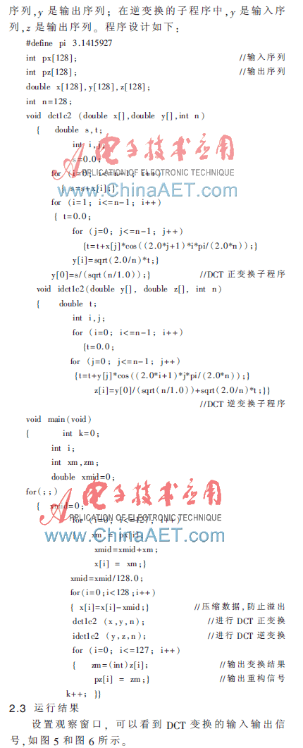 本文说明了数据采集ADC的功能和FFT算法的原理以及程序设计流程图,在CCS调试平台下,采用C语言编程实现了FFT算法,并且实时性好。阐述了离散余弦变换DCT基本原理,基于TMS320F2812 DSP实现了离散余弦变换。程序运行结果表明,DSP能够快速高效地完成一系列数字信号处理算法[4]。