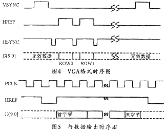 系统配置完毕后,便可进行图像数据的采集。图4和图5是数据采集与输出的时序图。其中VSYNC是场同步信号。HREF是水平同步信号。PCLK是象素数 据输出同步信号。HREF为高时即可开始有效数据采集,而PCLK下降沿的到来则表明数据的产生,PCLK每出现一个下降沿,系统便传输一位数据。在 HREF为高电平期间,系统共可传输640位数据。在一帧图像中,即VSYNC为低电平期间,HREF会出现480次高电平。而下一个VSYNC信号上升 沿的到来则表明分辨率640×480的图像采集过程的结束。