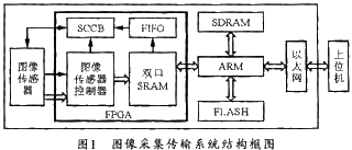 本系统的结构框图如图1所示。图中,图像传感器模块负责图像采集,FPGA用来控制CMOS图像传感器芯片,ARM负责图像数据的交换、以太网芯片的控制 及UDP/IP协议的实现,以太网模块主要实现以太网数据传输,SDRAM用于存储图像数据,FLASH为程序存储器。系统工作时,先由FPGA将 CMOS传感器采集的数据存储到双口SRAM,再由ARM从FPGA的双口SRAM中读取数据并存储到SDRAM,存满一帧图像数据后,ARM便通过以太 网芯片将数据发送给上位机。