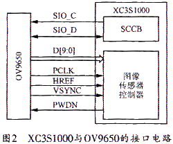 FPGA主要用于图像传感器的控制、图像数据的缓存及外围芯片时序的产生。考虑到图像处理算法的实现需要,本系统选用了Xilinx公司的XC3S1000,它属于SPARTAN-3系列,容量为100万门。在本设计中,FPGA通常运行于80 MHz。XC3S1000与OV9650的接口电路示意图如图2所示。FPGA的内部结构包括CMOS控制单元、SC-CB接口单元、双口RAM单元、FIFO单元等。其中CMOS控制单元又包括帧同步模块、场同步模块、像素时钟模块等。