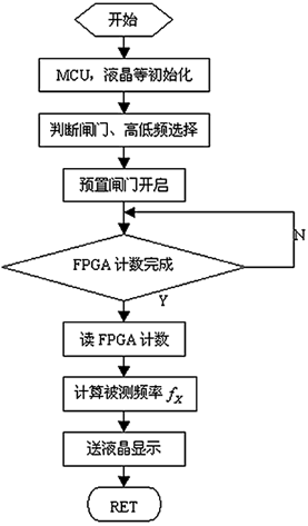本 系统整体功能的实现,大部分由MCU完成。软件主要完成的功能是初始化后,程序判断硬件的预置闸门时间,选择被测的频率通道(高/低频);FPGA根据预 置闸门产生同步闸门开启计数器,计数完成后给MCU送出完成信号,MCU开始分次读FPGA计数值存入内存单元,读完后通过浮点运算,计算出频率值送液晶 显示。软件流程图如图5所示。