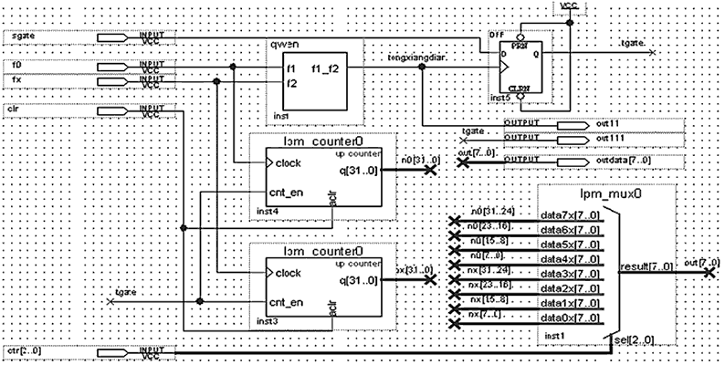 图 2为FPGA整体原理图设计,其中标频f0和被测fX经过同相点检测模块qwen,产生的相位重合点信息见图3中的输出out11;sgate信号为 MCU发出的预置闸门信号,与产生的同相点信号经D触发器模块形成了同步闸门tgate来控制f0和fX的计数,计数值经总线控制转换后传送给MCU。