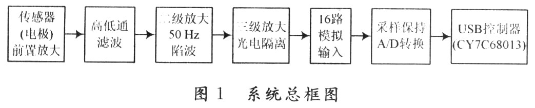 脑电信号采集电路包括:脑电信号放大、滤波、A/D转换及USB接口电路四部分,总体构成如图1所示。