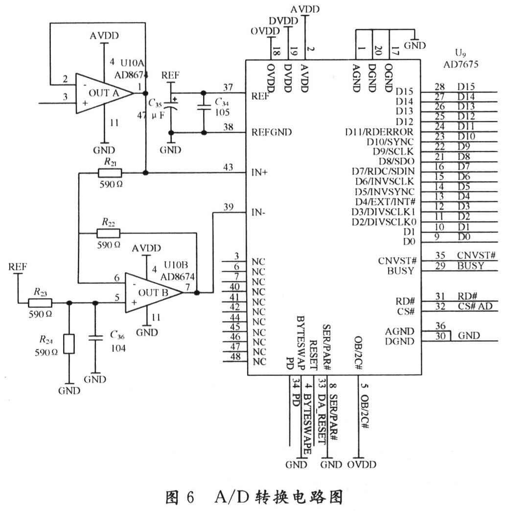 A/D转换电路(见图6)的采样精度为16位,采样频率为1 000 Hz。USB控制器通过CNVST#管脚(AD7675的35号引脚)控制AD7675对每路脑电信号进行转换,同时还通过查询BUSY管脚 (AD7675的29号引脚)来获知AD7675当前的状态。USB控制器还要响应主机的请求,把脑电数据及时、准确地传送给主机。为了提高转换的准确 性,设计了采样保持电路,负责把16路脑电信号同时锁存,然后逐一进行转换。由于每秒产生32 KB(16×16×1 000)的脑电数据,因此为了保证有足够的空间暂时保存这些脑电数据,在CY7C68013芯片外扩充了一块SDRAM,容量为256K×16 b。