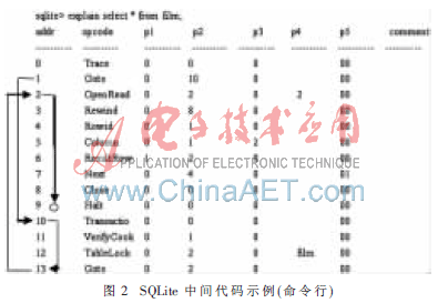 在官方提供的下载中,有编译好的命令行可执行程序,可以作为完全的SQLite数据库管理工具。同时,它也考虑了一些Debug和Test功能,可以利用它们深入了解SQLite的内部机制。可以利用SQLite命令行程序中的explain命令查看由代码生成器生成的中间代码的形式,这只需要在相应的SQL代码前面加上explain就可以了。如以搜索的命令行显示(如图2所示,箭头表示实际执行顺序):