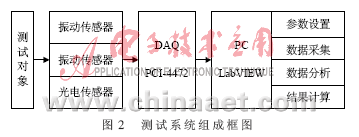 该测试系统要实现对测试对象振动数据的采集、对采集的数据进行滤波,通过PCI总线传输到计算机上,利用LabVIEW软件对数据进行分析和处理。如图2所示,测试系统分为硬件和软件2个部分。硬件部分主要实现数据采集和数据传输功能;软件部分主要实现对数据的分析、处理、显示和计算功能。
