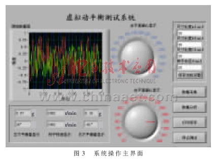 计算机通过数据采集卡采集3路信号,由虚拟仪器进行前置处理、频谱分析、校正平面之间的分离解算,最终算出左右两面的不平衡(g)、校正角度(°)、以及实测转速(r/min)。仪器主界面如图3所示。