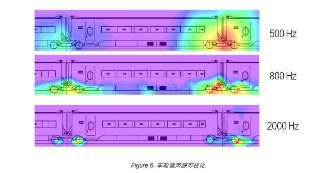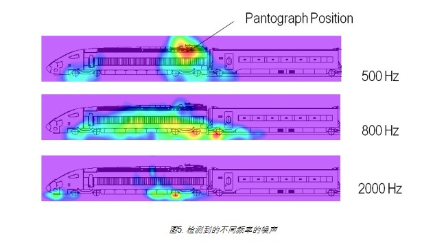 在高频部分,车轮形成的噪声源相当明显。这里显示了每一个车轮都有不同的噪声幅度。因此,该技术极有可能用以监测车轮的工作状态,便于维护。