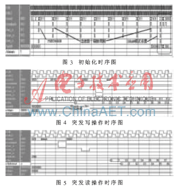 SDRAM控制器实现:SDRAM控制模块与FPGA端的SDRAM存储器相连,以FullPage模式从FPGA端的SDRAM存储器中高速读写数据;触发FullPage的REFRESH的命令,既保证数据不丢失,也能保证刷新的完成。在发出FullPage命令以后,必须给出一段空操作的延时或读操作。时序仿真分别如图3、图4、图5所示。