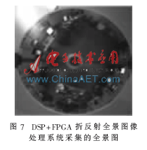 实验采用ALTERA公司的CycloneII系列的EP2C35-F672-8 FPGA以及2片Hynix公司的32 bit SDRAM HY57V283220LTP-7,其中电路板由直流稳压源供电。由2 048×2 048的4百万像素,每秒15帧的Camera Link 接口的CCD相机采集得到的灰度图像数据经过LVDS差分串行信号转并行芯片DS90CR288A进行转换,FPGA通过该控制器进行整页突发写操作将图像数据写入到SDRAM A器件中。在乒乓缓存作用下,控制器将进行突发读操作,将SDRAM B中的图像数据通过DMA方式与DSP进行数据交换。DSP接收数据后完成全景图像解算,然后将数据通过DMA方式传送回FPGA,最后再将数据经过LVDS并行转串行转换芯片DS90C385A转换为Camera Link信号,输出到Camera Link接口的液晶显示器上,以1 024×768的分辨率进行实时显示。实验采集的全景图如图7所示。