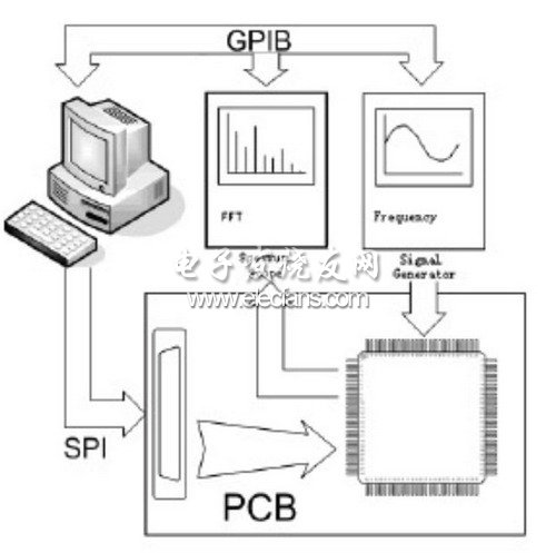 通过相关的GPIB接口总线对设备的控制指令控制频谱仪,可以使频谱的捕捉在4秒钟内完成,整个测试流程在1分钟内完成,有效地节约了测试时间。在多片测试中,测试员启动批处理文件就可以完成快速测试流程。对比传统测试方案,该方案不需要反复更换测试仪器探头及调试测试仪器,只需要更换开关电源及待测芯片即可。