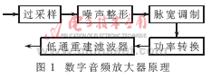 随着电子系统数字化的不断深入,人们对乐音信号回放的要求也越来越高,因此低失真、高效率的D类放大器已成为研究的热点。但目前D类放大器大多是使用模拟脉宽调制,如果要放大数字信号,还需要DAC将数字信号转换成模拟信号。实际上,可以直接对数字音频信号进行数字脉宽调制来实现放大器的数字化[1]。基于数字脉宽调制的数字音频放大器的基本结构如图1所示。数字幅值编码信号(PCM)送入过采样电路,经过Σ-Δ调制器进行噪声整形,再经过数字脉宽调制器调制成PWM脉宽信号,然后由PWM脉宽信号去控制功率转换电路中的功率MOS管的开启和关闭,输出的功率信号经过低通平滑滤波器之后,即可重建原来的模拟音频信号。Σ-Δ调制器在数字音频放大器中起着关键的作用。在数字脉宽调制对数字信号进行PWM调制的过程中,由于PCM信号是对信号的幅值进行量化,而数字PWM调制是对信号在时域上做量化,因此必须将时域上的量化和信号幅值相关联,即受幅值的调制,从而使输出包含基带的信息。一个n位的PCM码,是通过对一个采样周期内的采样值经过2n级量化编码得到的。如果让转换后的脉宽信号保持信号的精度,则在一个采样周期内对一个采样值在时域上也要做2n级量化。而加入了Σ-Δ调制器后,它将再次量化输入的PCM信号,将输入的高精度信号量化为低精度信号,而且仍然保持了信号的信噪比指标。量化位数的降低大大降低了数字脉宽fs·2n(fs为信号采样率),如果n减小一半,工作时钟将成指数下降。因此Σ-Δ调制器的设计尤为重要。考虑到后级功率转换器的效率和线性度及系统的功耗,而且调制器的过采样率不会很高[2],在设计系统时,将使用多位高阶级联的Σ-Δ调制器,以提高输入信号的带宽。