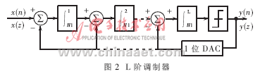 L阶Σ-Δ调制器如图2所示。Σ-Δ调制器的阶数就是调制器前向通道积分器的个数。从图中可以看出,L阶Σ-Δ调制器的前向通道包括L个积分器和嵌于反馈回路的量化器,每个积分器的输入均为前一个积分器的输出与1位DAC的输出之差。反馈回路的作用使得第一级积分器的净输入趋于零,即DAC的输出与调制器的输入信号X(n)基本相等,亦即X(n)≈Y(n)。