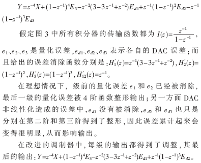 可以看出最后一级的DAC误差ed3已经被消除掉了,ed2的整形函数也比传统的调制器提高了一阶,只有ed1没有得到整形,但它相对于传统的结构在消除DAC非线性量化误差方面已经有了明显的提高。