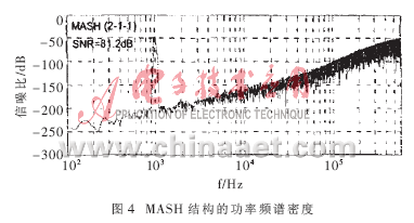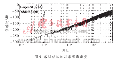 利用MATLAB对本文提出的改进结构和传统的2-1-1结构(MASH结构)同时进行了行为仿真和比较。在本文提出的结构中,选择积分器的增益系数分别为:a=1/2、b=2/5、c=1/2、d=1,它的第二级和第三级中AD/DA转换器的位数都为4,且AD/DA转换器的性能指标和MASH结构都一样。而在4阶MASH结构中,增益系数分别为:a=1/2、b=2/5、c=1、d=1。为了比较非线性化对2个调制器的影响,假定组成单元的最大不匹配值为0.1%,积分器最大非线性化范围为±0.05LSB,设输入信号频率为1kHz,信噪比为-20dB,过采样率为32,带宽为20kHz,则可得出如图4和图5所示的2个调制器的功率频谱密度。图 4表明MASH结构中很小的DAC非线性误差就很容易造成带内干扰。而图5所示的调制器尽管信噪比的峰值由于增益系数比较小而比MASH结构小,但其信噪比比MASH的要高。分析它们的信噪比还可以看出,由于DAC的非线性误差,MASH结构的信噪比下降了18~20dB,而本文给出的结构只下降了3~4dB。二者之间15dB的差异充分表明了本文给出的结构在消除DAC非线性误差方面比传统的2-1-1级联调制器要好得多。