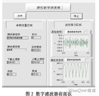 利用文本软件设计实现的滤波器在使用过程中往往出现难以调整波形系数,与硬件接口程序复杂,开发周期长等问题。而使用LabVIEW 设计的滤波器不仅设计简单,而且使用起来要比利用文本文件实现的滤波器方便得多。