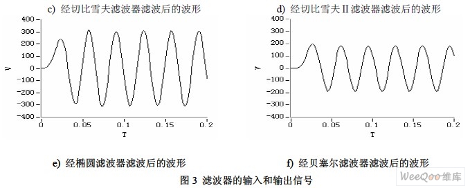 滤波器的输入信号是从电力系统中采集的,信号中含有频率为50Hz,有效值为220V 的基频分量,和频率为100Hz、150Hz、200Hz 的二次、三次、四次谐波。现欲提取出基频分量,滤去高次谐波,采用低通滤波方式滤波,滤波阶次为8 阶,纹波为0.1,衰减为60,下截止频率为50Hz,分别采用巴特沃斯滤波器、切比雪夫滤波器、切比雪夫Ⅱ滤波器、椭圆滤波器和贝塞尔滤波器滤波,滤波器的输入信号与不同滤波器的输出波形如图3 所示。由图3 可以看出采用不同的滤波器滤波,滤波效果是不同的。在此实例中,巴特沃思滤波器和切比雪夫滤波器的滤波效果相对较好;而切比雪夫Ⅱ滤波器的滤波延迟时间较长;贝塞尔滤波器滤波的衰减较大。因此,要根据不同的工况要求来选择合适的滤波器滤波。