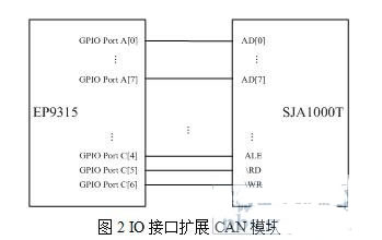 微处理器的通用IO口可以提供一个简便的方法来控制SJA100T。EP9315的GPIO信号提供了很大的灵活度来满足SJA1000T时间上的要求。将SJA1000T数据地址复用总线全部与EP9315的通用IO接口连接。其它信号线WR、RD、ALE……也与IO接口连接。具体连接方式参考图2。