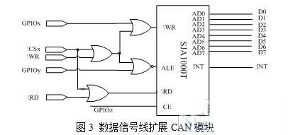SJA1000T数据地址总线复用,而整个ARM9系列包括ARM920T数据和地址总线分开。这就使得它与ARM9系列的连接不能像传统的用于51单片机系列方式扩展连接,本文给出两种扩展方式 :全部IO口连接方式和最少IO口的数据信号线连接方式。