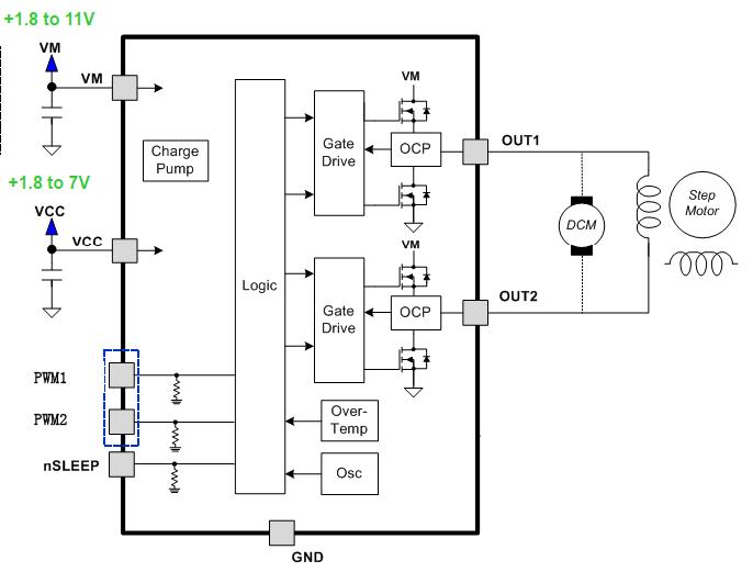 DRV8837的内部架构图如图2所示。可以看到,它有两个电压源,而且具有的宽泛工作电压,一个给芯片供电(VCC),电压范围为1.8 V~7 V;一个直接给电机供电(VM),电压范围为1.8 V~11 V,其电流输出能力为1.8A连续值/ 1.8A 峰值,支持多达6 节碱性电池或2 节锂离子电池组应用。李志林经理介绍到:“独立设置的电源系统有助于提高整体系统的使用范围,可有效地防止由于电池电压瞬间下降而引发的欠压保护,有助于减少系统噪音和提高整体性能。”我们也可以看到DRV8837有两个输出,它既可以驱动一个马达,也可以同时驱动两个马达,因为DRV8837支持每组半桥的独立控制。设计时,采用低功耗的MCU(如TI的MSP430)控制PWM1、PWM2及nSLEEP接口,就可以完成对电机的控制。