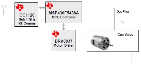 DRV8837 评估板现已开始供货,其特性包括:板载速度、睡眠及方向控制;支持便捷评估/ 上电的微型USB 连接;板载MSP430 微控制器(MCU) 可全面评估DRV8837 的性能,为使用外部MCU 提供更高的灵活性;重要控制及测试点的便捷访问。图4和图5分别为电子门锁系统架构图(MSP430FR5739 + DRV8837)和气表系统架构图(MSP430F5438A + DRV8837),可见超低功耗MCU与低功耗马达驱动能实现更低的系统功耗和更小的系统面积。