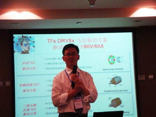 DRV8x系列的产品特点和发展方向是什么样的呢?李经理简单明了地进行了阐述。整个DRV8x驱动马达芯片的驱动能力最高可达60V/60A,将其应用在大型步进电机、有刷电机是非常不错的。步进马达方案电压从1.8 V到60 V,电流高至12 A。在传统的马达驱动方案中,客户往往需要一个性能很好的MCU,但现在把索引表放在驱动中,这样对MCU的要求会少很多,这是一个发展方向,即尽量把外设所需的功能集成进去。另外,我们把预驱动前级电路和内置功率MOS的驱动电路集成进去,客户只要再加上MOS 驱动和MCU就可以驱动马达。