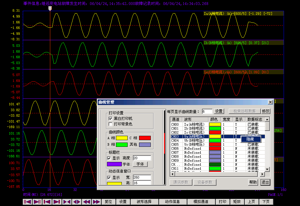 系统提供了完全支持Comtrade格式的故障录波数据分析工具,波形数据的采集支持零漂过滤,方波判断等。