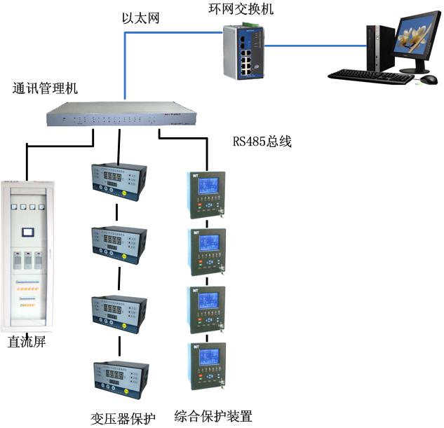 系统采用工业以太网加现场总线的结构模式。主干信道是光纤工业以太网环网到各变电所,为每个变电所设置一台通讯管理机,监控分站采用RS485现场总线方式与各微机综合保护装置或智能采集模块相连,采集变电所开关设备的运行参数和状态,实现就地集中数据监测和设备控制的功能。同时通讯管理机对采集到的信息进行处理、转换,通过以太网环网平台集中上传到系统后台主机。
