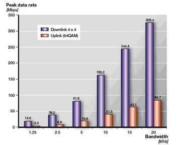 我们从图3所示的峰值速率可以看出,LTE满足并超过了下行100Mbps和上行50Mbps的目标。实际上,如果分配20MHz的频谱,LTE的下行速率可超过325Mbps,上行速率可超过80Mbps。