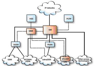 GSM和WCDMA/HSPA系统通过SGSN(服务GPRS支持节点)和演进后的核心网之间的标准接口集成到演进后的系统中。这些接口包括:与MME相连、用于传送上下文并在不同接入技术之间建立承载的接口,与网关相连、用于与用户设备(UE)建立IP连接的接口。因此,网关节点的功能相当于一个服务WCDMA/HSPA终端设备的GGSN(网关GPRS支持节点)。