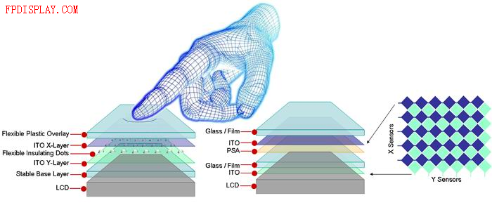 电阻式触控屏包括有一个柔性顶层,然后是一层ITO,一个空气隙,然后是另一层ITO。面板有4根线附到ITO层上:“X”层的左右侧各一根,“Y”层的顶端和底端各一根。