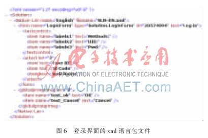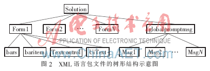 为确保切换语言时能够置换所有的界面文字信息,所有的文本控件对象都必须在XML语言包中有唯一的节点与之对应。本文中设定的XML语言包文件的结构如图2所示。