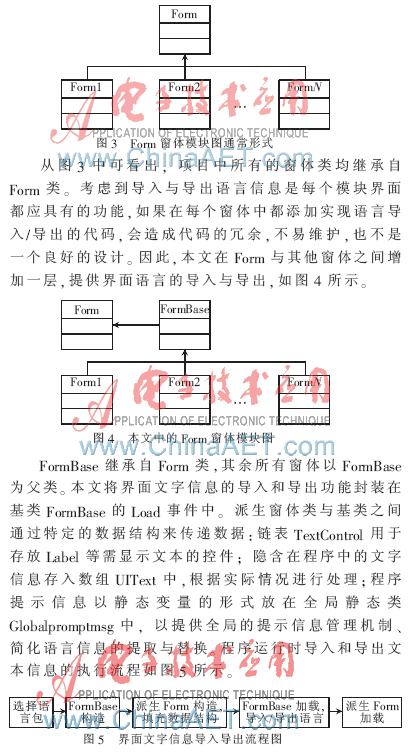 程序运行前选择需要的语言包文件。运行后每个窗体被打开时,首先在构造函数中完成必要的数据结构填充,继而在加载基类时实现语言信息的导出与载入,最后加载窗体。只要每个派生的Form类填充了相应的数据结构,即可以利用基类中的语言信息导出与载入功能,实现整个软件所有窗体的语言替换。