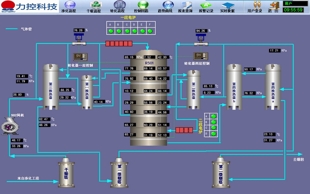 动态流畅的现场流程画面显示,能够让现场工作人员实时了解冶炼制酸工艺流程中的实时数据和各个设备的运行状态。同时具备强大的数据处理能力,具有故障报警、事件处理、用户权限管理机制。