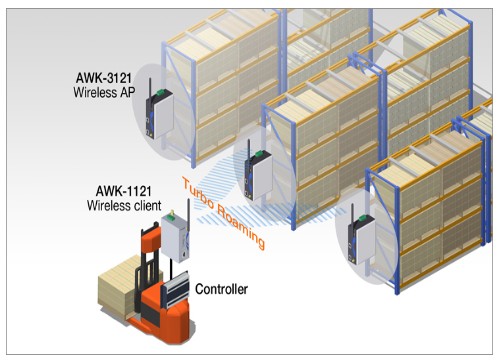 为了导航和监控无人AGV在工作区通道上的行进情况,必须通过车载传感器和收发器进行不间断的数据采集和发送。具有如此狭小空间的AGV上装有20多个传感器和控制器,使得在系统设计时,每一个组件的尺寸都是必须考虑的重要因素。Moxa AWK-1121/1127系列无线客户端支持802.11 a/b/g,是Moxa具有最小尺寸的工业级无线客户端。产品设计紧凑,甚至低于一罐汽水的高度,这样可以放在AGV中,既不占用空间,也可以有效的整合其他组件,从而实现AGV数据的无线通讯。