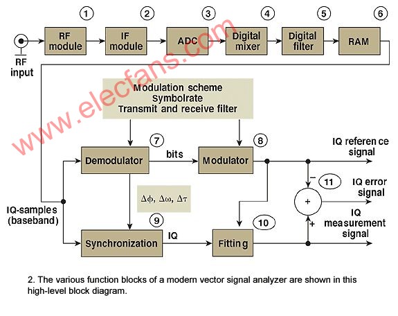 图2为矢量信号分析仪的框图。经数字调制的RF输入信号通过RF及中频级(模块1、2)前往模-数转换器的输入端(模块数字信号处理器 DSP对基带信号解调至位级(图2中模块7),并产生一个与非失真发射信号相应的基准信号。信号分析仪仅需了解调制结构及适当滤波(模块8)。在对中心频率偏移、相位及符号定时(图2,同步模块9)校准后,被测信号的幅度和相位与基准信号相适应,以取得EVM的均方根值( RMS)。在最后一级中,将被测信号与参考信号进行比较(图2模块11)。在此时对典型调制误差(如与时间对应的幅度误差,与时间对应的相位误差)进行计算。这些信号用于表示矢量及星座图或用于在以后计算失真特性。