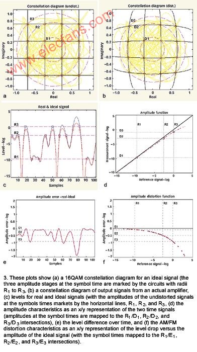 图3(a)所示为经上升余弦滤波的未失真的16态正交振幅调制信号的理想星座图。图3(b)所示为纯幅度失真放大器的输出信号。两图中都标识了复杂基带信号的矢量图。实际的星座点(图3(b))在其理想位置的附近。栅格的曲率一定程度上表示了非线性、基于幅度调制的幅度失真。图3 (c)所示为幅度-时间特性。理想信号为蓝色曲线,实际信号为红色曲线。为便于识别,用正方形或圆标识符号时间。该理想信号的三个幅度等级用R1至R3的水平线表示,而测量信号则用D1至D3的水平线表示。