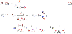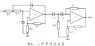 图6所示的二阶带通滤波器是一种二阶压控电压源(VCVS)带通滤波器,其滤波电路采用有源滤波器完成,并由二阶压控电压源(VCVS)低通滤波器和二阶压控电压源高通滤波器串接组成带通滤波器。