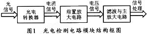 光电探测器所接收到的信号一般都非常微弱,而且光探测器输出的信号往往被深埋在噪声之中,因此,要对这样的微弱信号进行处理,一般都要先进行预处理,以将大部分噪声滤除掉,并将微弱信号放大到后续处理器所要求的电压幅度。这样,就需要通过前置放大电路、滤波电路和主放大电路来输出幅度合适、并已滤除掉大部分噪声的待检测信号。其光电检测模块的组成框图如图1所示。