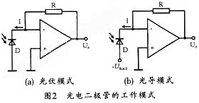 光电二极管一般有两种模式工作:零偏置工作和反偏置工作,图2所示是光电二极管的两种模式的偏置电路。图中,在光伏模式时,光电二极管可非常精确的线性工作;而在光导模式时,光电二极管可实现较高的切换速度,但要牺牲一定的线性。事实上,在反偏置条件下,即使无光照,仍有一个很小的电流(叫做暗电流或无照电流1。而在零偏置时则没有暗电流,这时二极管的噪声基本上是分路电阻的热噪声;在反偏置时,由于导电产生的散粒噪声成为附加的噪声源。因此,在设计光电二极管电路的过程中,通常是针对光伏或光导两种模式之一进行最优化设计,而不是对两种模式都进行最优化设计。
