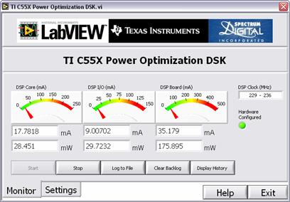 采用 LabView 和 C55 电源优化 DSK (C55 Power Optimization DSP Starter Kit),设计小组能尝试采用不同的实施方案,并用类似于图 3 所示的 GUI 工具对功耗加以调节。