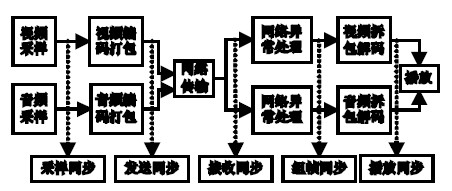 本方法基本思路是:在音视频数据的采样、编码、打包、发送、网络传输、接收、网络异常处理、拆包、解码、播放这十个处理过程中,采集、编码、打包、拆包和解码的时间基本上固定,不会因为网络环境差异造成时延的差异,而发送、网络传输、接收、网络异常处理四个过程则具有较大的随机性,其处理时间会随着网络性能的不同有较大的差异,进而造成播放时音视频的不同步。因此唇音同步处理的重点就在于保证发送、网络传输、接收、网络异常处理这四个过程中音视频的同步,即图1 中发送同步到组帧同步之间的部分。