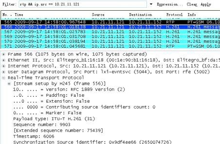 终端10.21.11.121 在正常网络环境下,以512k的带宽呼叫终端10.21.11.152,呼叫建立5 分钟之后用Wireshark 抓到的音视频数据包如图4 和图5 所示: