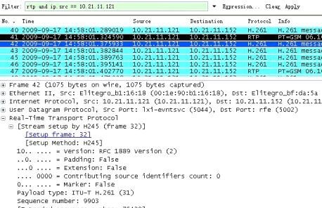 将本方案应用在开源的H.323 协议栈OPENH323 上[7],实现了一个简单的基于PC 机的H.323 桌面终端。两台终端建立会话,通过IP cloud 在两台终端间模拟各种复杂恶劣的网络环境,然后使用Wireshark 抓包,可以看到音视频包的发送接收时间以及有关包头信息,进而计算出传输中引起的音视频偏差时间。考虑到算法的复杂度,本方案选择了相对较易实现的H.261 和GSM6.10 作为音视频编解码协议。图3 是呼叫建立后在发送端10.21.11.121 上截的图。发送端敲击麦克风,接收端看到敲击动作的同时听到敲击声,同步效果良好。