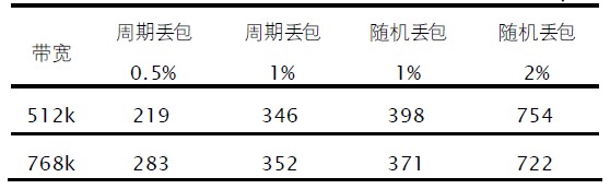 多次改变呼叫带宽和网络丢包率,反复试验,得到的不同环境下由传输引起的音视频时间差如表1 所示。