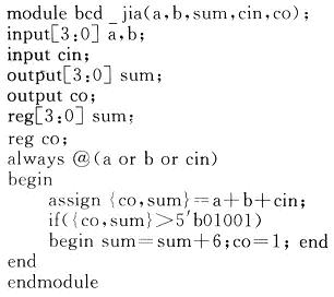 一位BCD码由四位二进制数组成,四位二进制数的加法运算会产生大于9的数字,必须进行适当的调整才会产生正确的结果。一位BCD码加法器的Verilog HDL源程序如下: