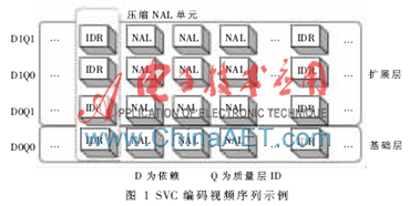 H.264算法在概念上可分为两层:视频编码层VCL(Video Coding Layer),负责高效的视频内容表示;网络抽象层NAL(Network Abstraction Layer),负责对数据进行打包和传送。NAL单元将视频数据基于bit流传输转到基于包的传输,实现了较高的网络友好性。H.264/SVC作为H.264编码标准的可分级扩展,采用基于离散余弦变换的分层编码方法,支持时域、空域和质量域三个维度的可伸缩编码[2]。通过对H.264/AVC NAL单元的扩展,将各个层次的视频访问单元分别编码成一个NAL单元,组成SVC编码视频序列,如图1所示。