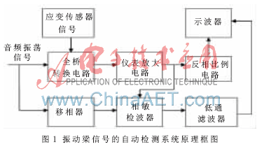 振动梁信号的自动检测硬件平台主要由ZY13Sens12SB传感器技术实验主控台、振动梁、应变传感器、移相器、相敏检波器、低通滤波器[8-9]等6部分组成。振动梁在音频信号的调制下在竖直方向不断往返振荡,导致振动梁应变片发生形变,应变传感器将该变化转换成电阻值的变化,通过全桥转换电路将电阻值的变化转换成电压,该电压经放大电路进行放大后,通过反相比例电路输出到RIGOL系列示波器。同时音频振荡信号经移相器移相后,在相敏检波器对放大电路放大后的信号进行检波,再经过低通滤波器将波形输出显示。系统原理框图如图1所示。