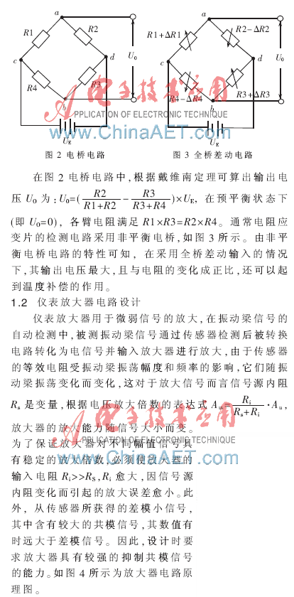 在电阻应变式传感器中,应变计是敏感元件,它将应变量转换成电阻的相应变化,本系统中利用全电桥电路将电阻的变化转换成电压后,再由测量电路进行测量,其基本形式如图2、图3所示。