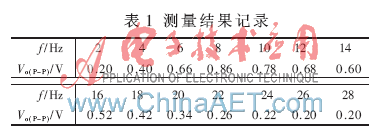 表1是音频振荡器输出频率改变时振动梁振幅相应的变化情况。从表1可看出,当音频振荡器输出频率从2 Hz增加到28 Hz的过程中,振动梁振幅先增大后减小,在音频振荡器输出频率f=8 Hz时,振动梁振幅达到最大值Vo(P-P)=0.86 V。